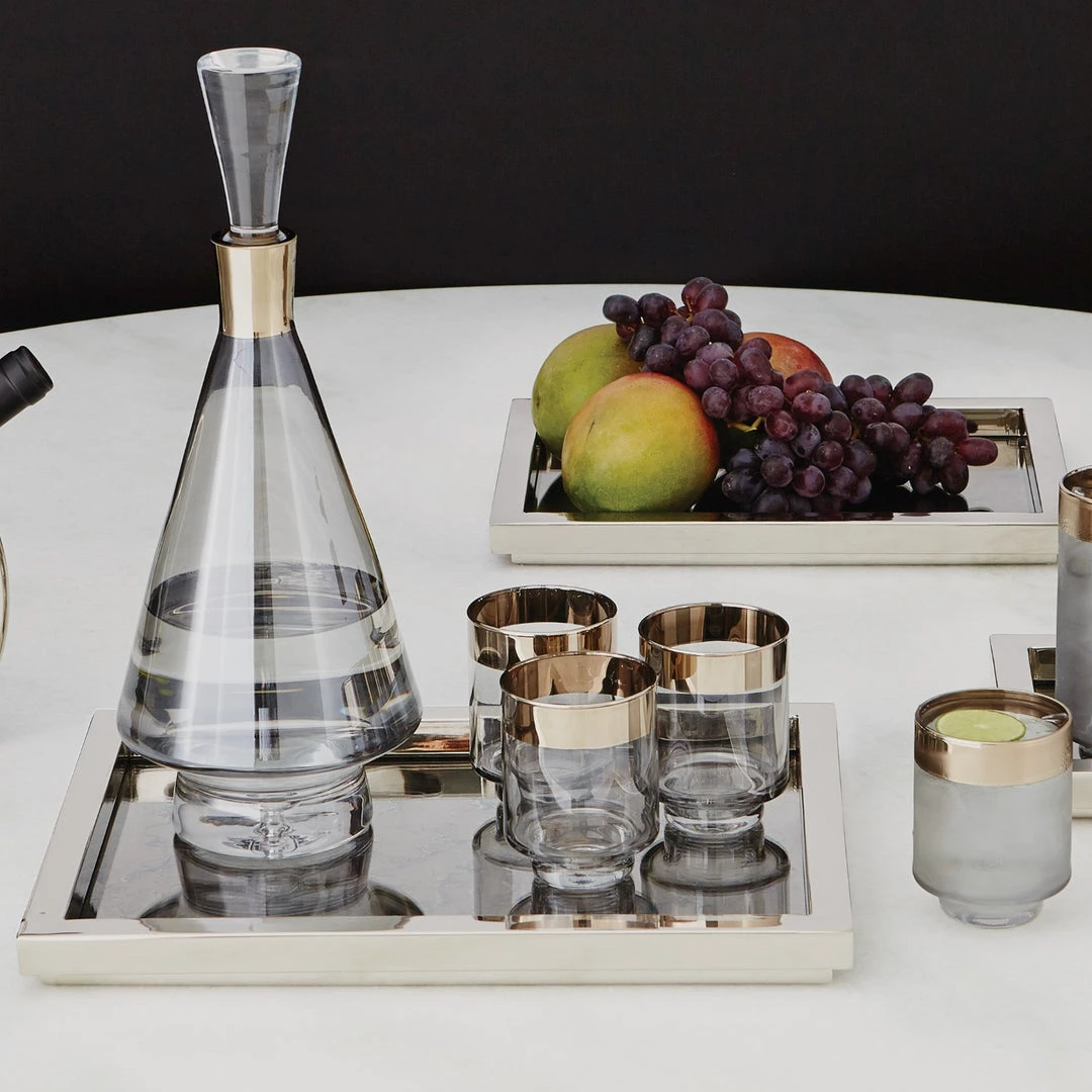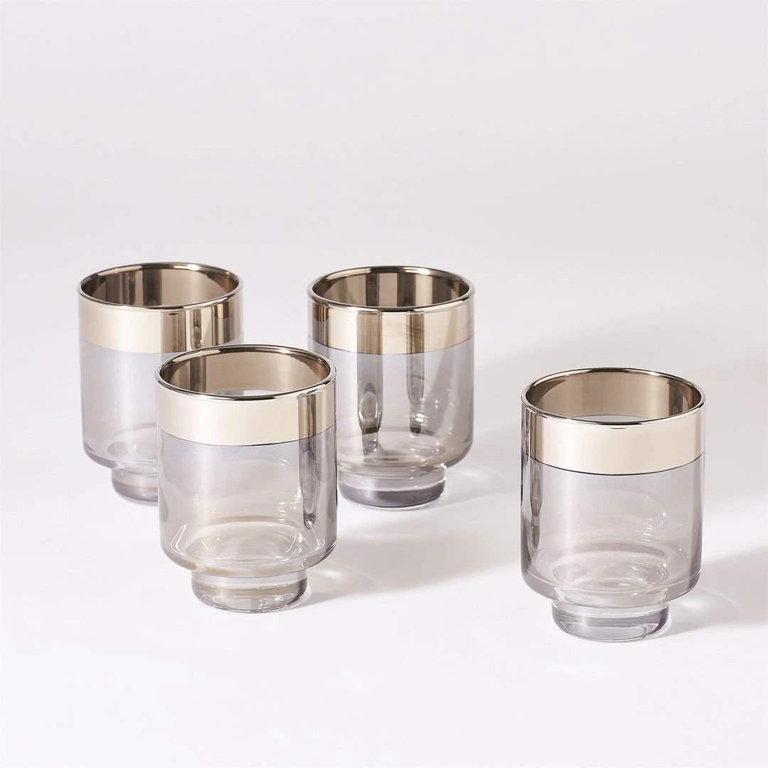 The Twilight Short Drinking Glass Set of 8 by Global Views is crafted from hand-blown smoked glass and detailed with a band of platinum metallic glaze. This set of 8 drinking glasses presents beverages with sleek elegance. Streamlined tumblers with a metallic twist, these glasses are ideal to complete your home bar or are a perfect choice for a chic hostess gift.