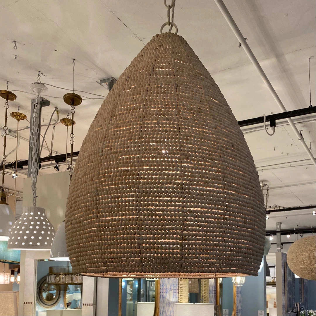 Strings of beads made with mango wood line the body of the oversized Gulf Stream Pendant from Jamie Young. A white iron chain compliments the natural tone and texture of this piece. A statement piece with repeating patterns and textures like this can help add interest to any coastal palette.