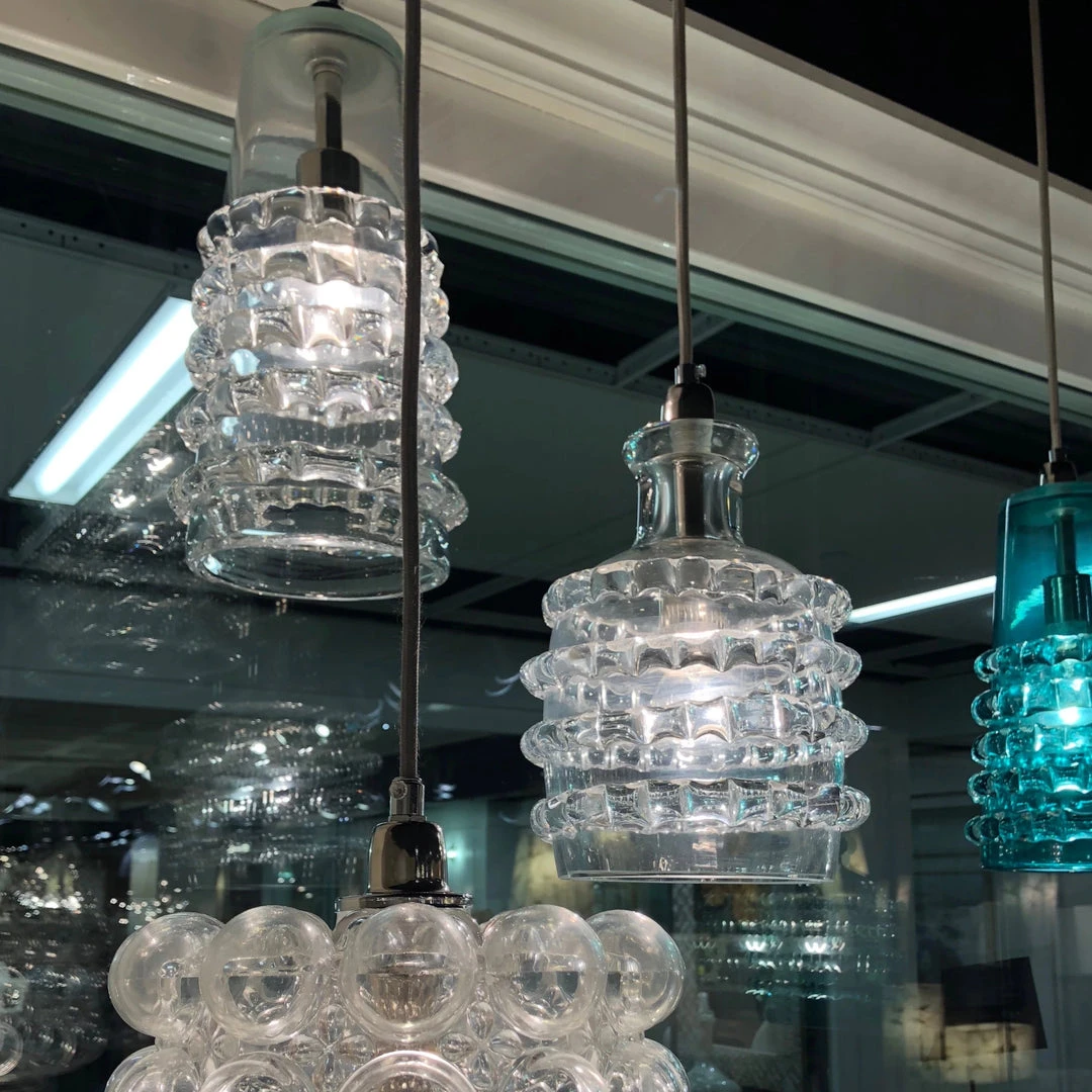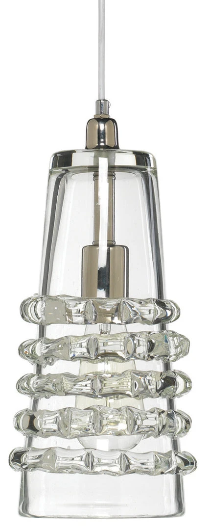 The Long Ribbon Pendant from Jamie Young features an elegant and unique glass design. The shape of this pendant emanates light beautifully through the facets of the ribboned glass. This unique light design delivers an eye catching and dramatic visual impact to your home. Hanging lights like the Long Ribbon Pendant from Jamie Young work well placed in multiples in the bathroom, entryway or hallway. Â
