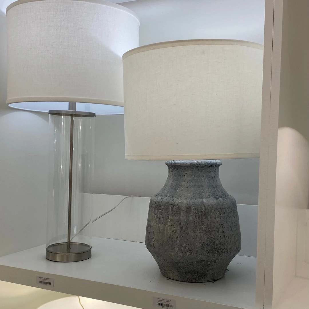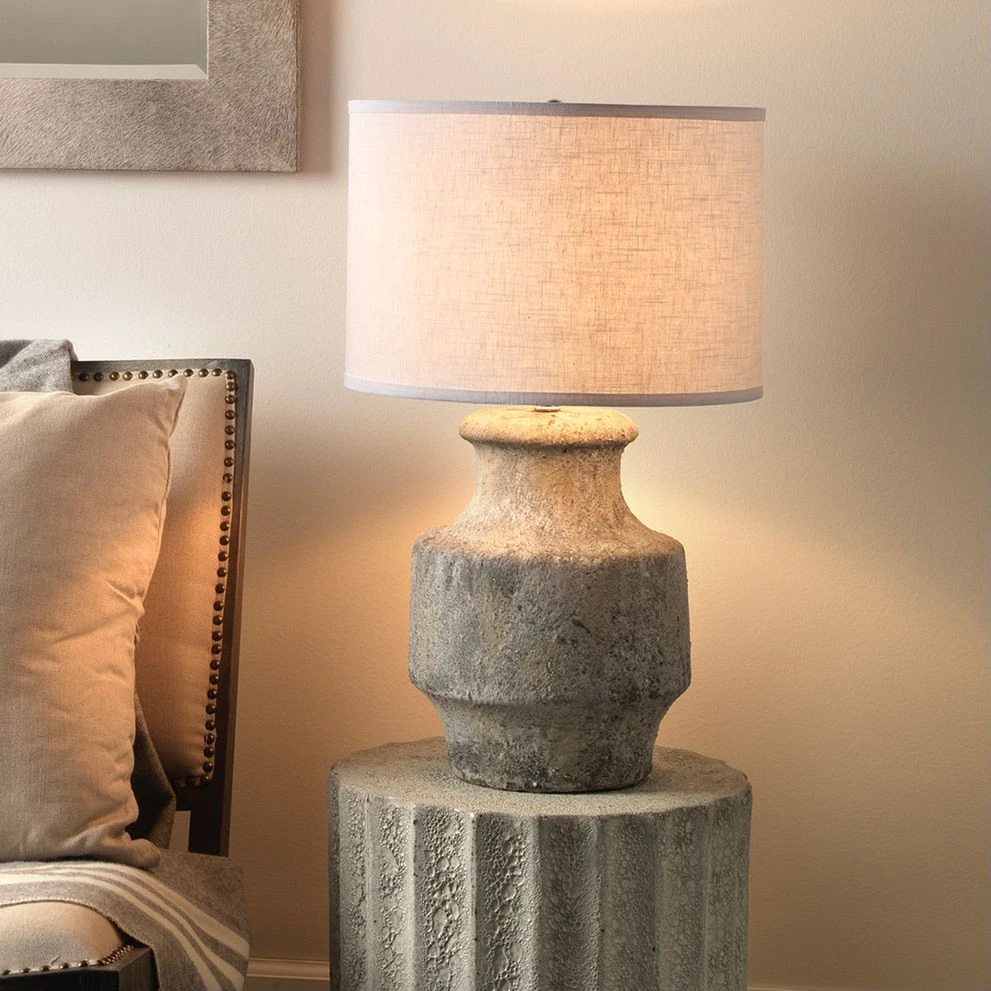 The Masonry Table Lamp from Jamie Young is crafted from ceramic with a grey concrete texture atop a distinctive modern base. The chipped and crackled finish is unique to each piece and a part of the aged aesthetic of the lamp. Handmade from clay, peeling and cracking are part of the beauty of this piece and should be expected. Lamps like the Masonry Table Lamp from Jamie Young are an ideal choice for the dining room, bedroom, living room or home office.Â
