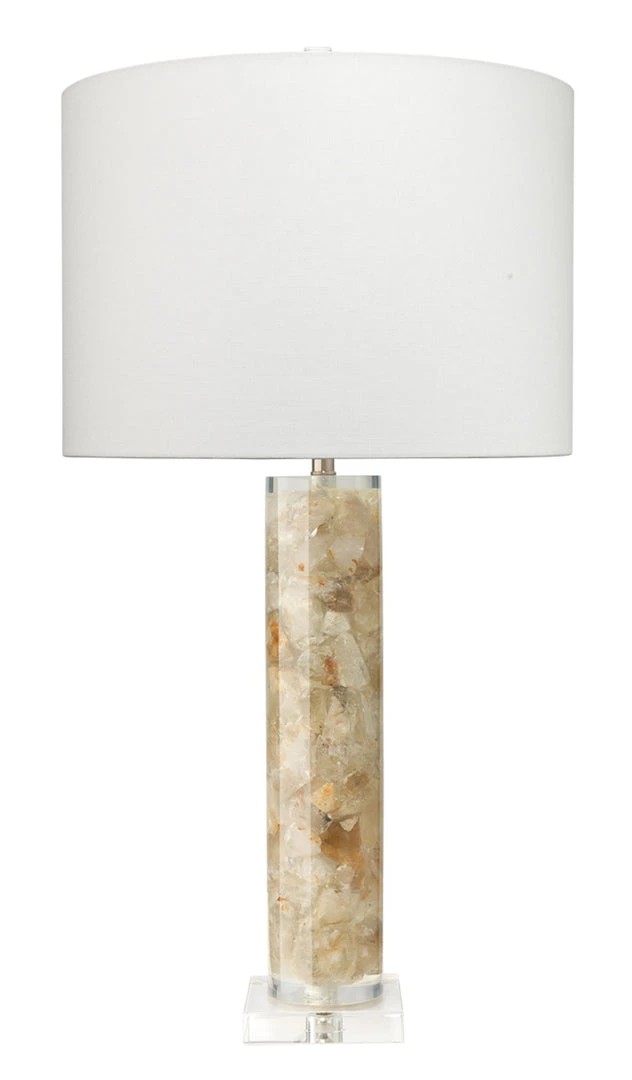 A slim cylinder of natural calcite forms the base of the Peyton Lamp from Jamie Young. The beauty of the natural stone is allowed to shine here and the rest of the lamp is kept simple with a square acrylic base, a white linen drum shade, and a cylindrical crystal finial. No two pieces of calcite, and no two lamps, will be identical.
