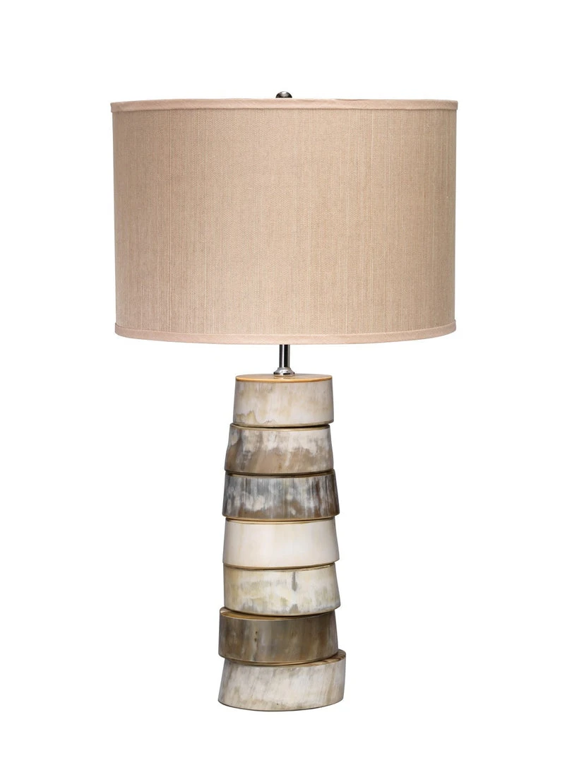 The Jamie Young Company Stacked Horn Table Lamp showcases hand-crafted discs from natural buffalo horn. Distinctive and unusual, table lamps like this create a sophisticated ambiance wherever used. Topped with a stone color linen shade, the Stacked Horn Table Lamp from Jamie Young Company delivers the perfect organic lighting source for your home or office! *Due to nature of horn, color and design will vary from lamp to lamp.