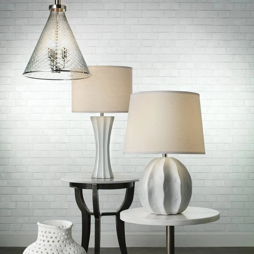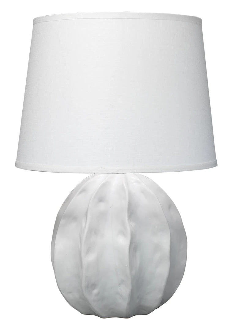 The Urchin Table Lamp in White from Jamie Young features a fresh take on the traditional coastal style.  Handcrafted from a neutral matte white glaze, the Urchin is inspired by an aqueous plant on a coastal shore. The Urchin is textured and pinch ribbed, and paired with a large linen cone shade. This table lamp makes a statement in the entryway, home office or living room.