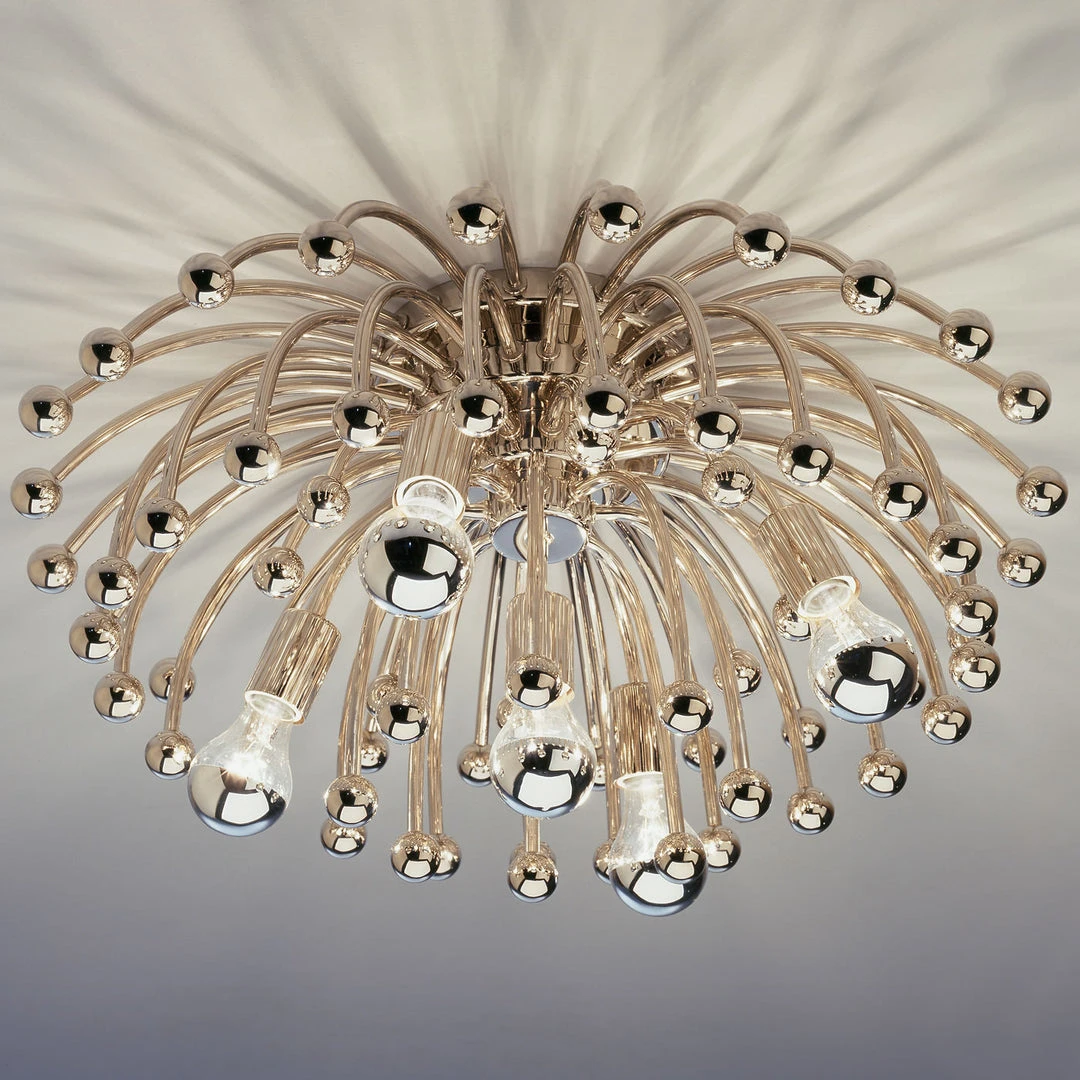 The Jonathan Adler Anemone Flush Mount in Polished Nickel showcases Hollywood glamour, created by its starburst effect that is produced by curved bars protruding from the wall or ceiling. Sleek with a touch of glam, this light fixture is full of modern style and was recognized in Elle Decor magazine. Picture the Anemone Flush Mount by Jonathan Adler making a statement above your dining room table, in the foyer or entryway.