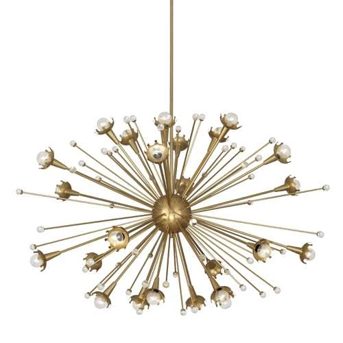 A groovy classic with our own twinkly twist. The Sputnik Chandelier from Jonathan Adler in Antique Brass is perfect for making your pad feel like a Parisian parlor. Our riff on this design staple features custom laser-cut crown cups that halo the bulbs for a modern glow. Tiny stems with crystal accents further reflect the galactic light and lend a grace to any room. * As seen in Elle Decor magazine.