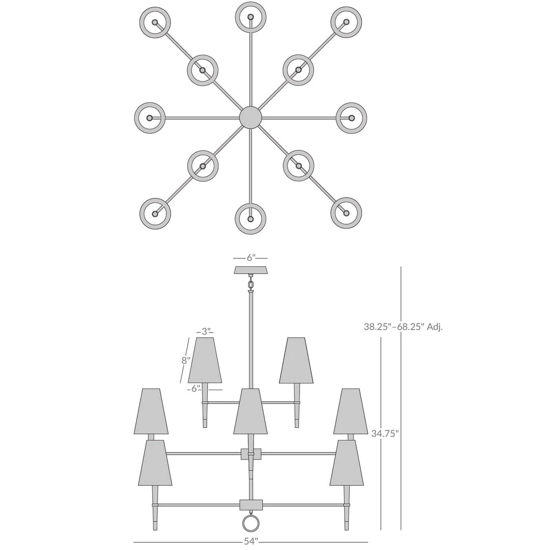 The Ventana Three Tier Chandelier from designer Jonathan Adler in Polished Nickel and ebonized wood offers modern twelve arm lighting. Topped with a neutral linen shade, this modern chandelier lighting projects a simple, understated elegance. Chandeliers like the Ventana Three Tier Chandelier from Jonathan Adler is ideal hanging over a dining room table, in a large entryway, or in a master suite!