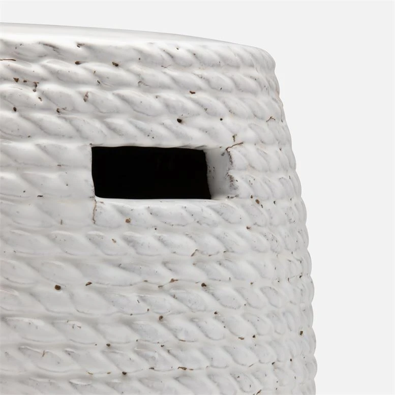 The Adrian Stool in White from Made Goods provides extra seating for indoor and outdoor spaces alike. What appears as a detailed rope stool is actually outdoor-ready ceramic expertly molded & glazed, the hand detailing of real rope shines through. The Adrian from Made Goods furniture is an ideal display stand for decorative sculptures or plants. *Each piece is handmade, never mass-produced, and built to withstand varied elements and temperatures. Safe for outdoor spaces.
