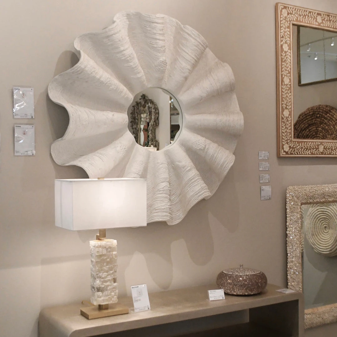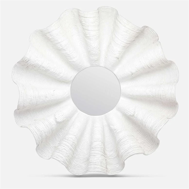 An artfully reproduced giant clamshell makes a dramatic statement in this showstopping mirror. The Ava Mirror in White Shell Resin Large from Made Goods is cast and sculpted to capture the beauty of this underwater treasure.