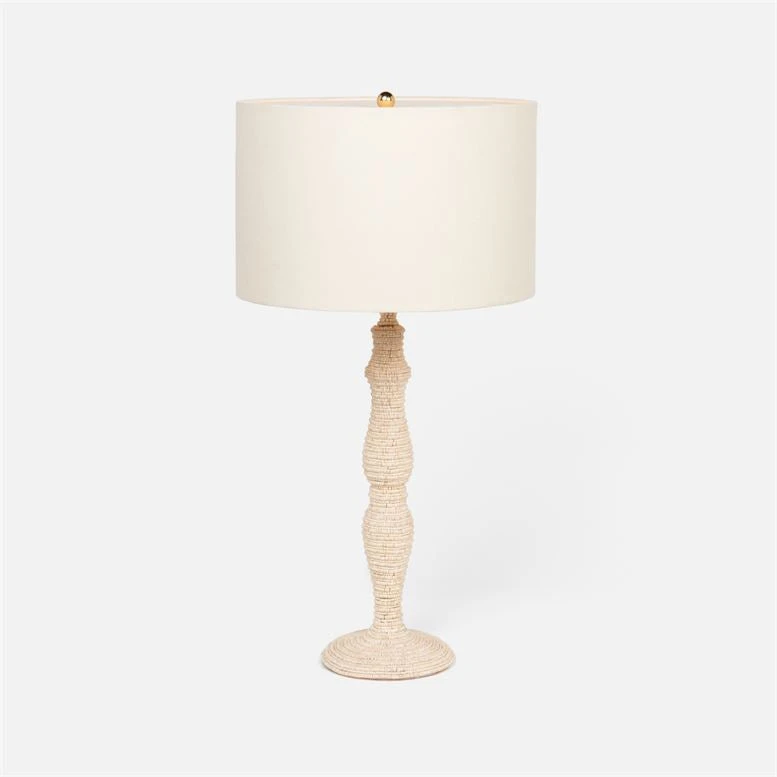 Two sizes of natural hand-strung coco beads are wrapped in tight circles around the Barlow Table Lamp from Made Goods. The textural feel of this graceful table lamp results in a striking, organic effect. Perfect in pairs for the bedroom, entryway, or living room. Partner with the Barlow Floor Lamp in the collection for the complete look.