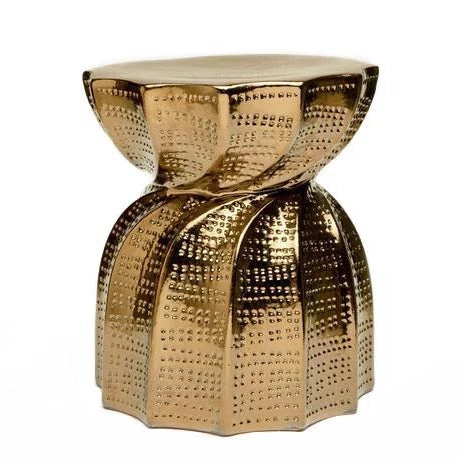 The Bea Stool in Crackled Gold from Made Goods features a round, faceted ceramic piece with a unique finish Use the modern Bea as extra seating or as a small side table indoors or outdoors. *As seen in House & Home magazine. **This item is handcrafted and may show slight variation in size from one piece to another. Not suitable for freezing temperatures. The manufacturer recommends the use of felt pads on the bottom to minimize surface scratching.Â