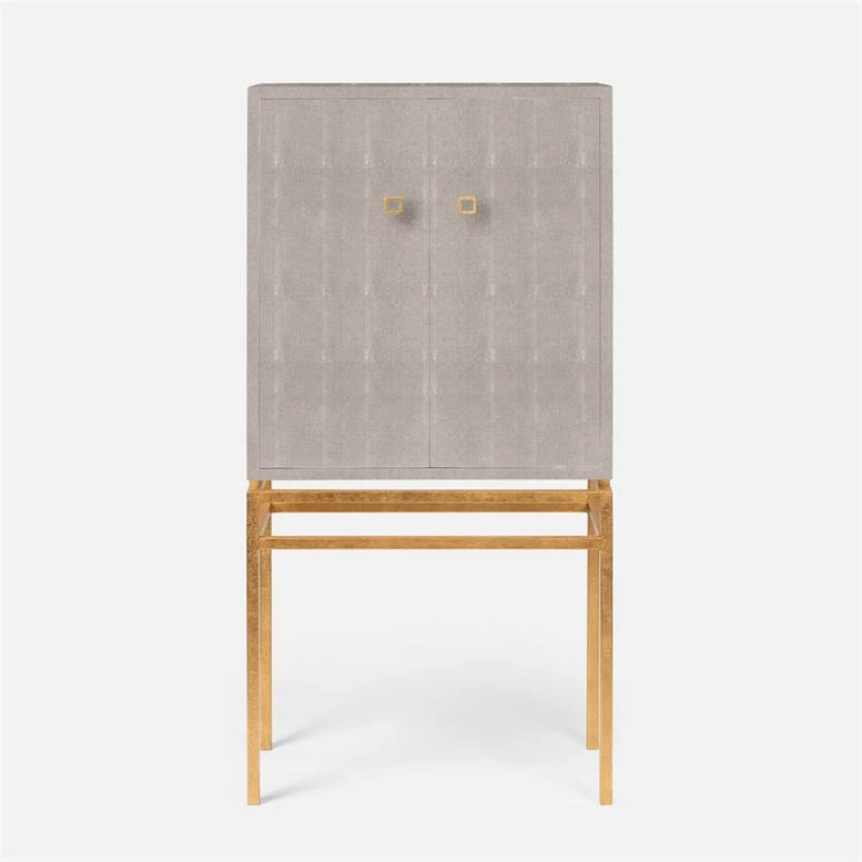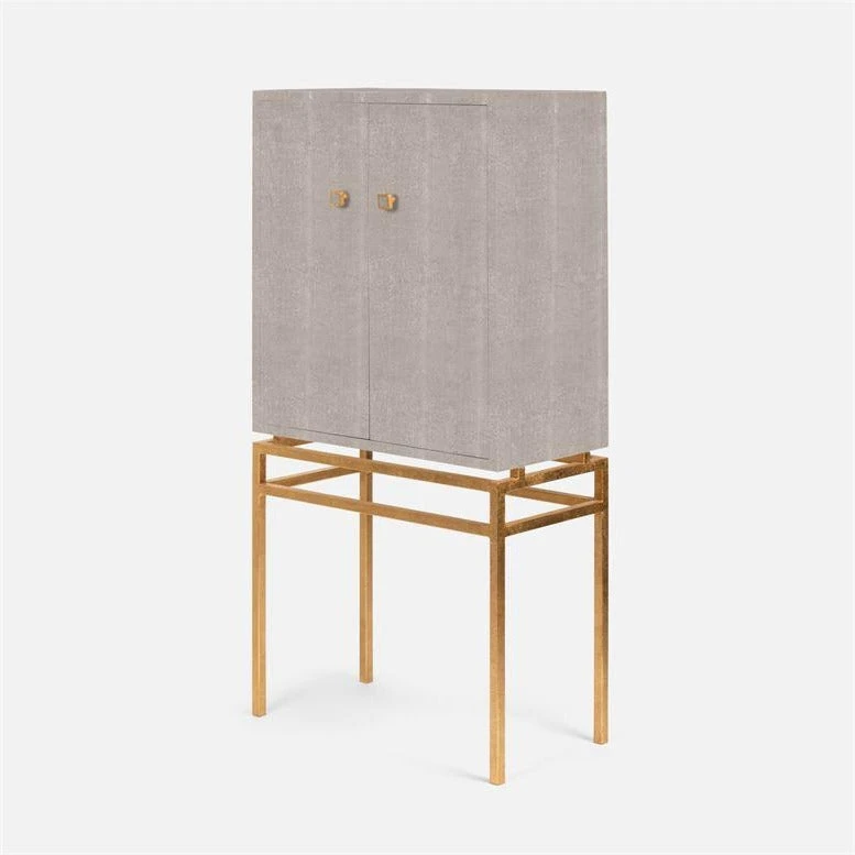 The Benjamin Standing Cabinet in Sand Faux Shagreen and Gold from Made Goods features a two-door cabinet perched atop an airy framework of metal legs, strengthened by a box stretcher. With a smooth-finished wood interior, adjustable shelves, and metal knobs, the interior can be configured to hold books, plates, or a bar set-up.