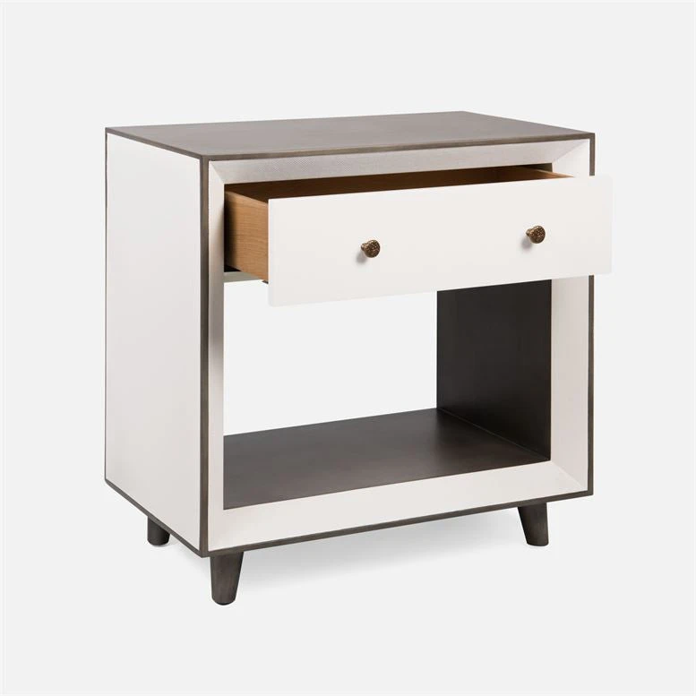 The Made Goods Blaine Double Nightstand in Pristine Faux Canvas showcases a contemporary multi-dimensional frame design in luxurious faux canvas and gray-stained wood. This one drawer side table offers functional storage, in a contemporary shape. *This item is handcrafted and may show a slight variation in size from one piece to another.