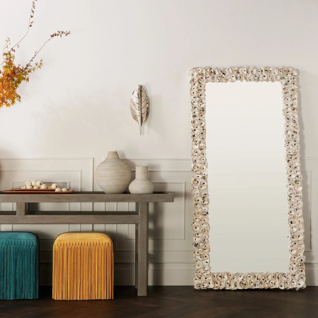 The Buford Floor Mirror from Made Goods features whole, unpolished oyster shells to create this striking mirror’s dramatic profile. Each shell is hand placed and set in resin. The result is a coastal vibe with an organic edge that creates a dramatic statement.Â