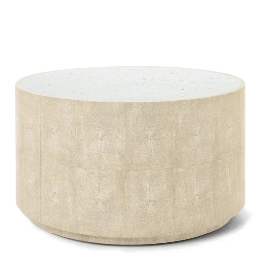 Made Goods presents the Cara Cocktail Table in a neutral Ivory color on a modern faux shagreen finish. This modern round coffee table is topped with luxe antiqued mirror that adds light and a dramatic presence to your living room or family room. Coffee tables like the Cara provide tabletop space for a decorative centerpiece and a place for your morning coffee or evening cocktail. *This item is handcrafted and may show slight variation in size from one piece to another.