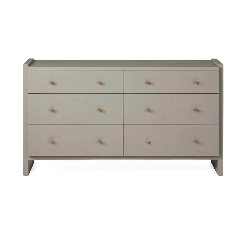 Add abstract shape and movement to your space with the Carrigan 60″ Dresser in Vintage Castor Gray Faux Shagreen from Made Goods. Featuring a geometric framework and off-set drawers, each dresser is meant to be seen from all angles. The neutral vintage faux shagreen complements the minimalist vibe of this extraordinary and versatile piece.