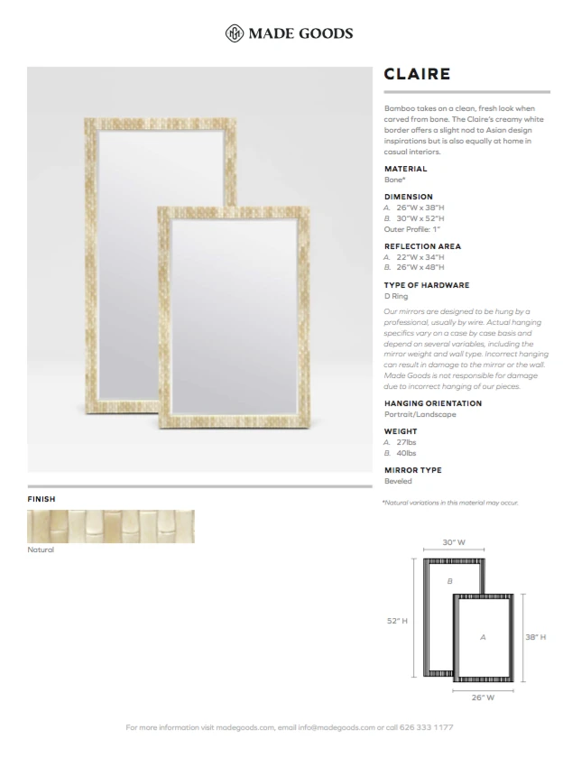 Bamboo takes on a clean, fresh look when carved from bone as featured in the Claire Floor MIrror from Made Goods. The creamy white border offers a slight nod to Asian design inspirations but is also equally at home in casual interiors. Brightening foyers, dining rooms, living rooms, bedrooms, bathrooms and home offices, the Claire from Made Goods is the perfect choice for casual elegance in your home or office.