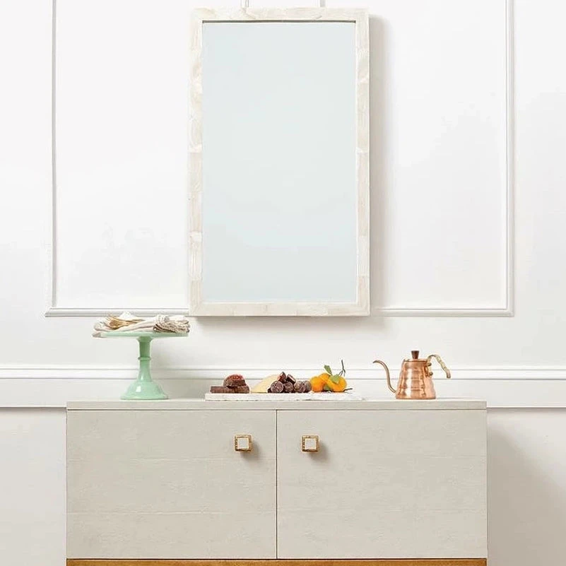 Made Goods Colette Wall Mirror in Kabibe Shell reflects a beach inspired design for your home that is both casual and formal. Neutral shades of white and cream colored shells are arranged in six rows encircling the rectangle shape of this decorative mirror. Hang this versatile mirror in either a vertical or horizontal position based on your wall size. The contemporary Colette brightens your space and gives you an outdoor vibe in your foyer, dining room or living room. Use as vanity mirrors in your bathroom with double sinks or bar mirrors in your home media center.