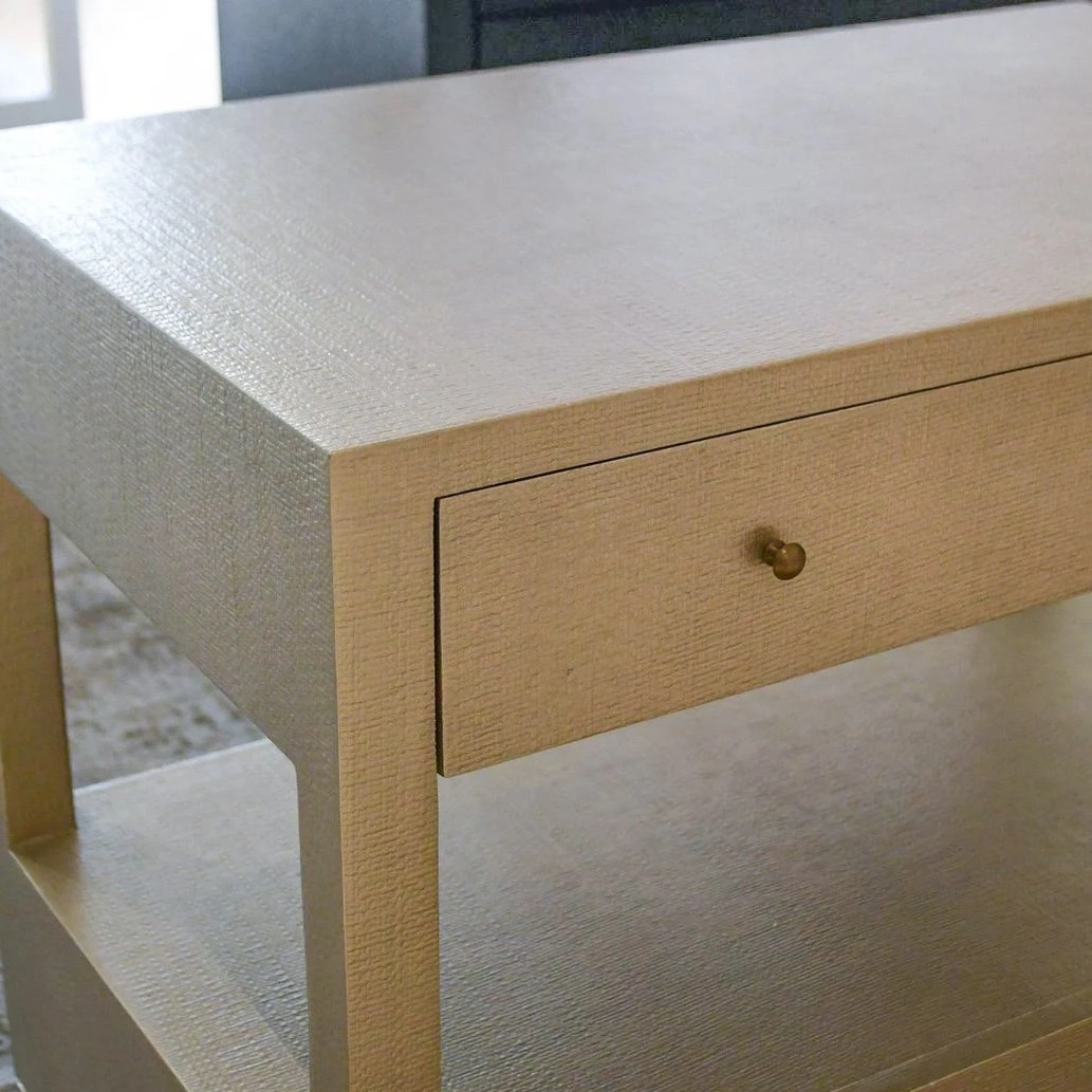 Made Goods oversized Conrad Nightstand in Champagne Raffia showcases a contemporary bedside table with an open shelf between two self-closing drawers with brass knobs. Place the extra large contemporary Conrad between two chairs in the sitting area of your master suite, family room, or your home office. *This item is handcrafted and may show a slight variation in size from one piece to another.