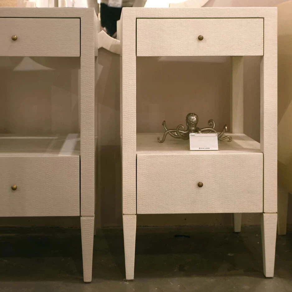 Made Goods Conrad Single Nightstand in Pristine white faux raffia features self-closing drawers and faux raffia textured finish, making this bedside table a must-have for your home! Clean contemporary lines deliver style and versatility with two drawers accented with brass knobs and an open shelf for storage. Place the square-shaped Conrad in your home office next to a chair or use as a sofa side table. Bedside tables like this one with its shiny reflective finish will add a touch of glam to your decor scheme. *This item is handcrafted and may show slight variation in size from one piece to another.