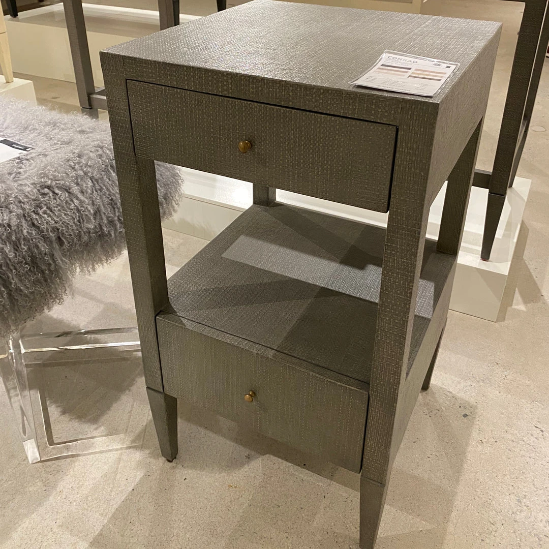 Made Goods Conrad Single Nightstand in Seal faux raffia features a square side table with 2 self-closing drawers, accented with brass knobs. Square bed side tables like this sophisticated beauty have tabletop space for lamps and decorative items. Storage is provided in two drawers for your miscellaneous items and an open shelf for additional storage or for displaying your decorative pieces. Use the modern contemporary Conrad as a living room side table beside your sofa, love seat, settee, or chair. *This item is handcrafted and may show slight variation in size from one piece to another.