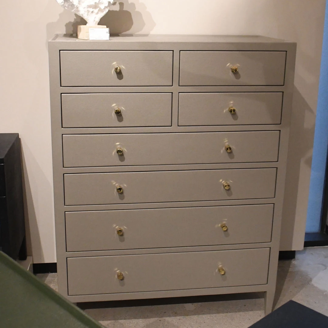 | Materials | Faux Raffia; 8 Linen-Lined Drawers; Brass Hardware |