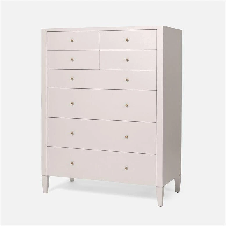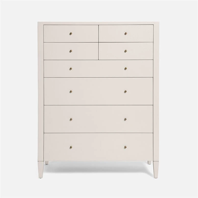 The Conrad Tallboy in French Grey Raffia from Made Goods combines design with functionality. The tallboy is covered in glamorous faux raffia and has eight wood-linen drawers offering ample storage. The Conrad Tallboy is the perfect addition to any bedroom ensemble and the newest addition to the Conrad Collection from Made Goods.