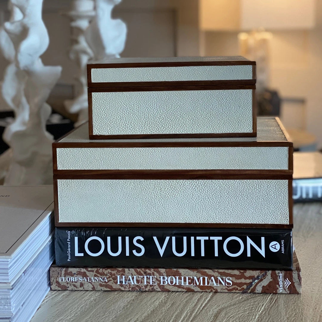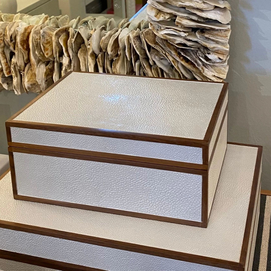 Made Goods showcases the Cooper Box Set in Blanc Shagreen, delivering a chic decorative accessory to adorn shelves and tabletops alike. This durable pair of decorative boxes are trimmed with wood. Perfect to store all your essentials in style.