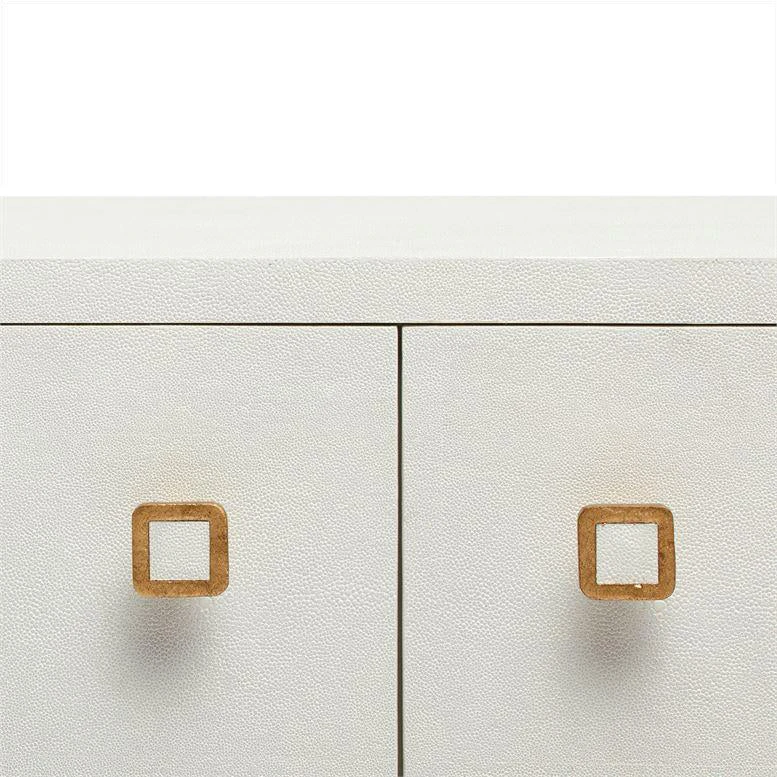 | Materials | Wood; Snow Faux Shagreen; Metal; Gold Finish; Faux Shagreen and Metal Handles; 4 Compartments; 1 Fixed Left Shelf; 1 Adjustable Right Shelf |