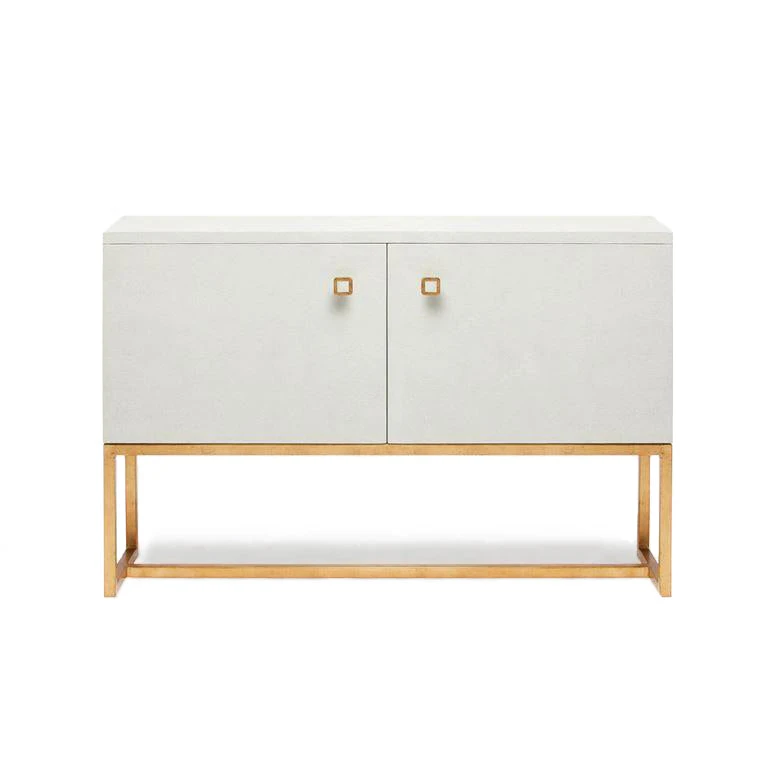The Made Goods Dallon 2 Door Buffet in Snow Faux Shagreen with gold metal legs and handles combines sophisticated style with functionality. Rectangular in shape, the narrow slender width of this versatile cabinet makes it ideal for smaller dining rooms and other rooms of your home. This modern contemporary Dallon provides storage in the dining room for your silverware, dinnerware, and table linens. Place this sideboard in your home office and use it to store office supplies. Or, use the Dallon in your living room or den as a bar cabinet. *This item is handcrafted and may show a slight variation in size from one piece to another.
