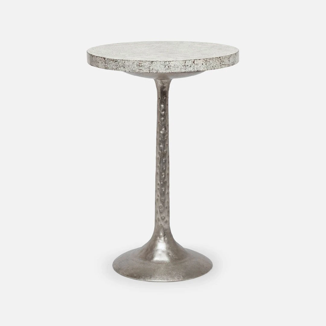 The Delancy Side Table in Silver and Grey Eggshell from Made Goods is the perfect addition to your home. This versatile side table is crafted with an airy base and a stylish eggshell top. For a modern touch, the Delancy works great next to a couch, an armchair, or as a stand-alone piece filling in the details of a space.