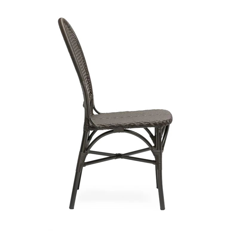 The Made Goods Donovan Side Chair in brown features gracious curves that round out this modern side chair. Expert construction, perfect pitch, and a woven seat and back offer a French Bistro style, making this brown seating the perfect accent when used as a living room side chair or dining room side chair. Suitable as outdoor seating.