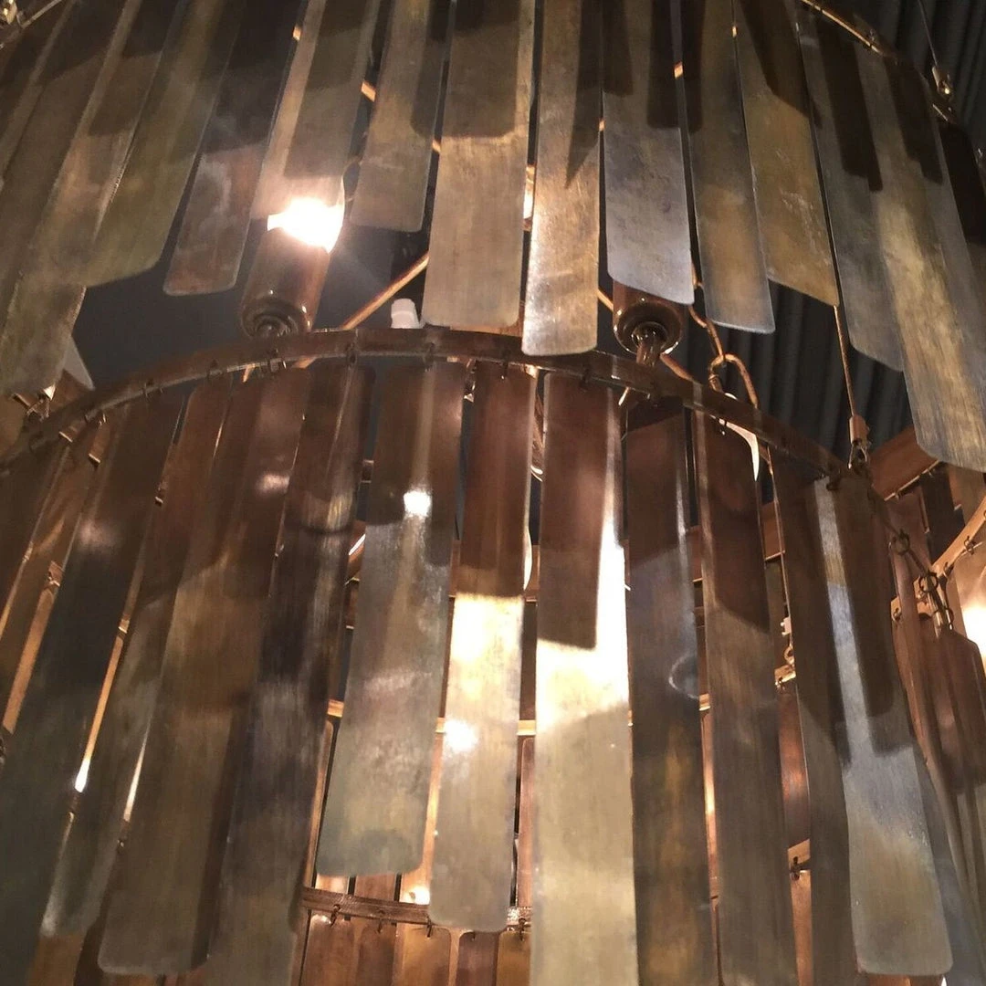 Made Goods Douglas Chandelier in Aged Brass showcases a round design of metal strips in varying lengths hanging from a three tier frame. Chandeliers like the Douglas can be used as foyer chandeliers or bedroom chandeliers. Make a sophisticated decor statement in your home or office with this handsome industrial chandelier.