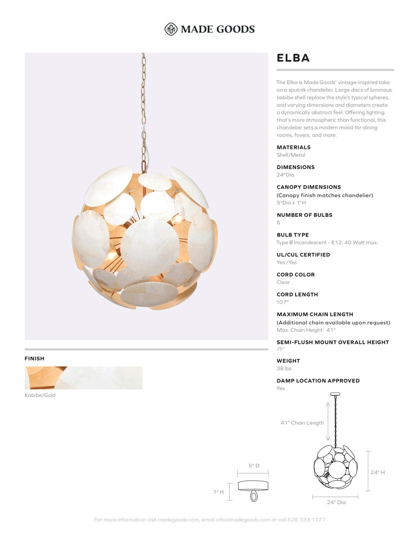 SKU: made-goods-7491380805 Categories: Brands, Chandeliers, Chandeliers, Dining Room, Kitchen & Dining, Lighting, Made Goods, Made Goods, New, New Arrivals, Sputniks Tags: Chandelier, Elba chandelier, Gold, Gold chandelier, Made good, Made goods lighting, Round, Sputnik