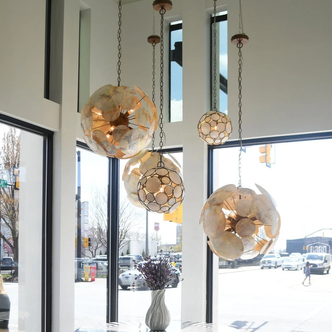 | Materials | Kabibe Shell; Metal; Requires Six 40watt Bulbs; Clear Cord |