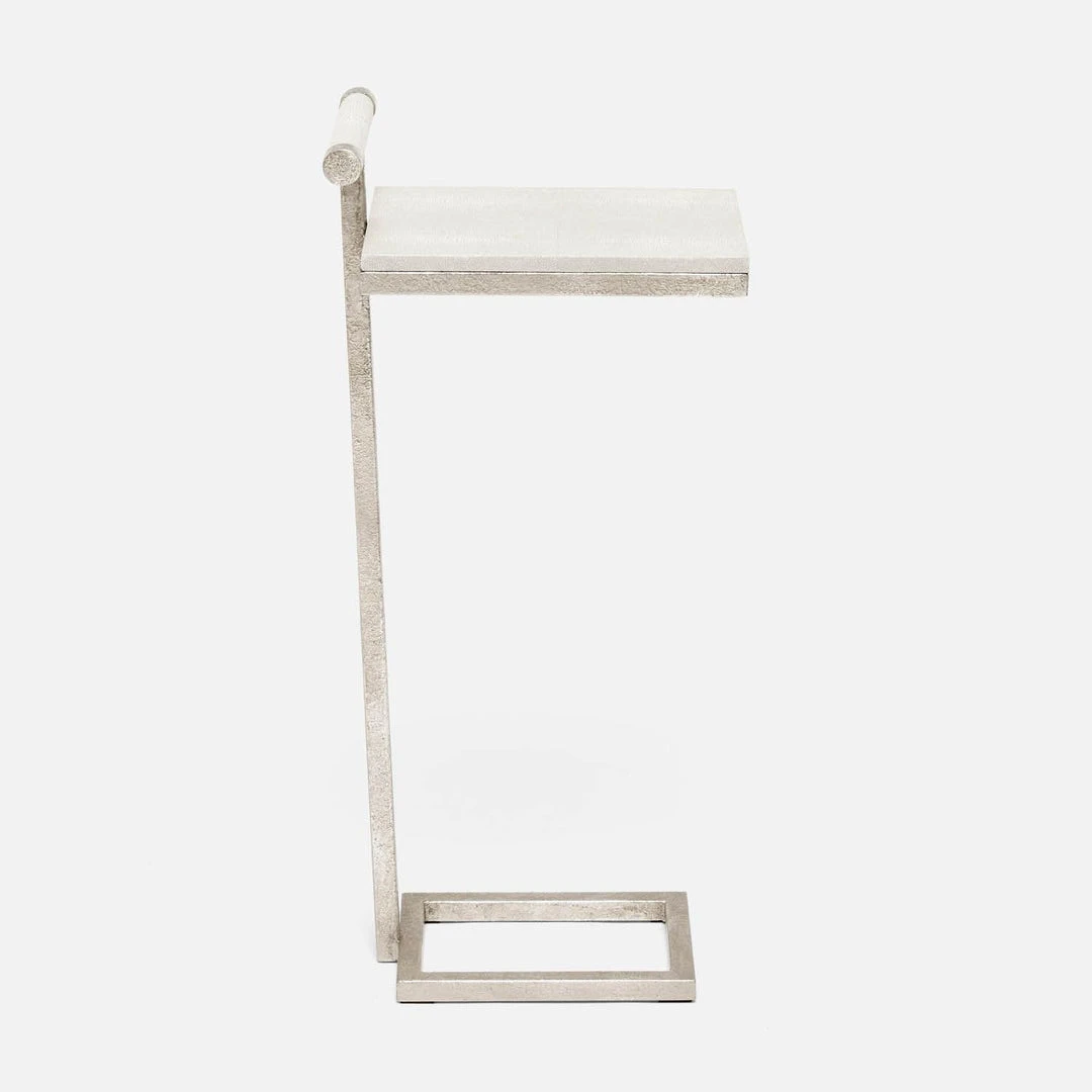 The extremely portable Ellery Accent Table in Blanc and Silver from Made Goods is the perfect table for simple couch-side convenience. A minimal metal base is topped with a faux shagreen panel and handle; use it for drinks, to hold a laptop while working, or to keep anything you need within arm’s reach.