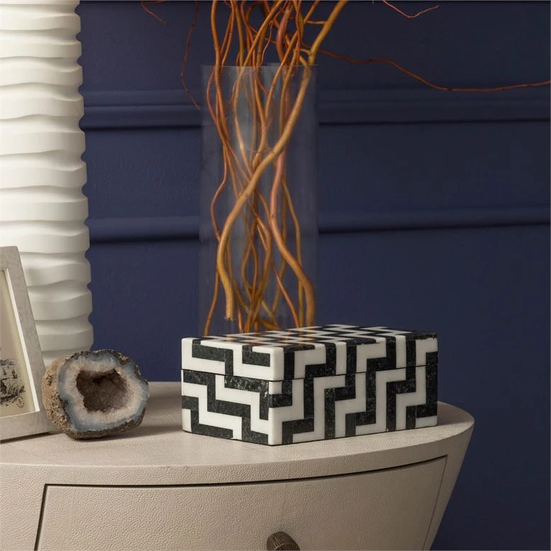 The Escher Box Set in Black and White from Made Goods is a sight to behold. Graphic mismatched patterns make a striking statement with just the right touch of whimsy. The Escher is perfect to adorn bookshelves and tabletops alike.