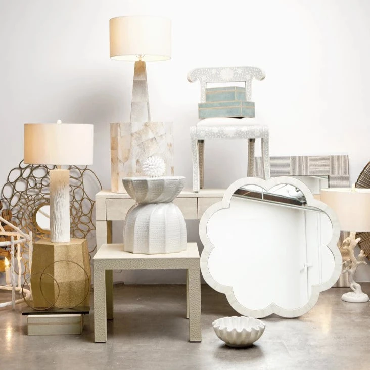 Made Goods Fiona Mirror in Natural Bone and metal features a curvy, floral patterned design. Nature inspired, wall mirrors like this chic modern lighting work beautifully as vanity mirrors in the bathroom. Consider using two or more of the scalloped Fiona mirrors down a long hallway, or wherever decorative mirrors can add stylish ambiance in your home.