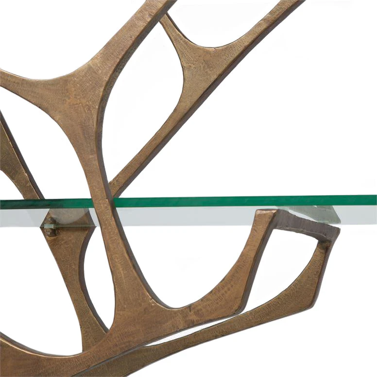 The Gerald Bookcase from Made Goods features an organic design of aged brass iron. The modern frame holds five glass beveled shelves for displaying your objects of art. Â The Gerald is a work of art on its own, but can do double duty by storaging your favorites or becoming a natural room divider.