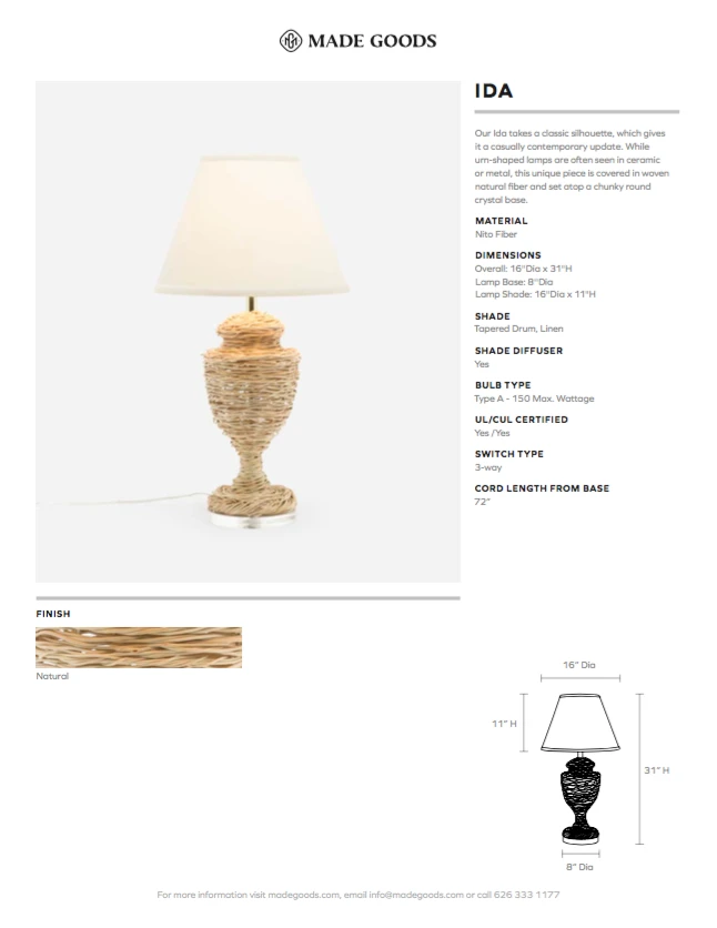 | Materials | Nito Fiber; Tapered Drum Linen Shade; Shade Diffuser Included; Requires One Type A 150 Watt Max Bulb; 3-Way Switch; Cord Length from Base: 72" |
