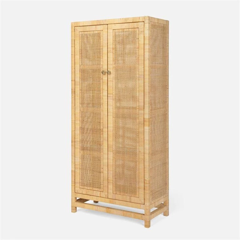 A tightly wrapped, natural peeled rattan frame complements the dense basket weave of the Isla Cabinet in Natural Peeled Rattan from Made Goods. Featuring three fixed wood shelves, with tightly wrapped natural peeled rattan edges that mirror the cabinet’s exterior structure, complete its well-tailored design.