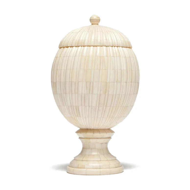 The Jana Urn in Bone from Made Goods is made of natural bone with vertical ribs. The striations on the surface are texturally rich and make this the perfect accessory for traditional to contemporary spaces or interiors alike.Â