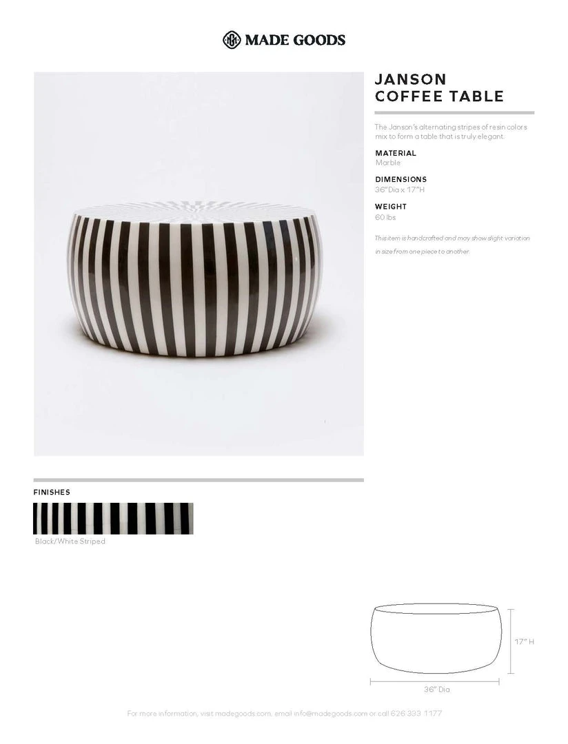 SKU: made-goods-7491196869 Categories: Brands, Coffee Table, Furniture, Made Goods, New, New Arrivals, Outdoor, Patio Styling, Tables Tags: Black coffee table, Bone, Coffee tables, Janson, Janson coffee table, Outdoor table, Round coffee tables, Striped coffee table