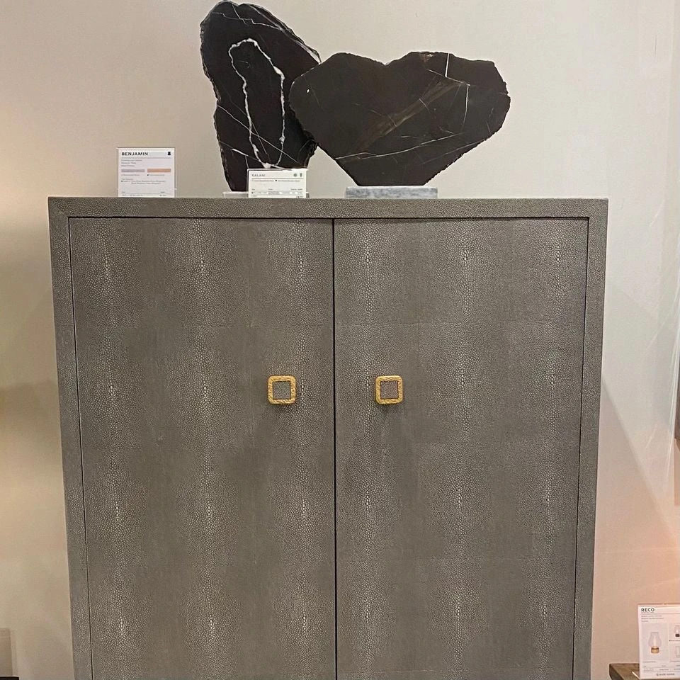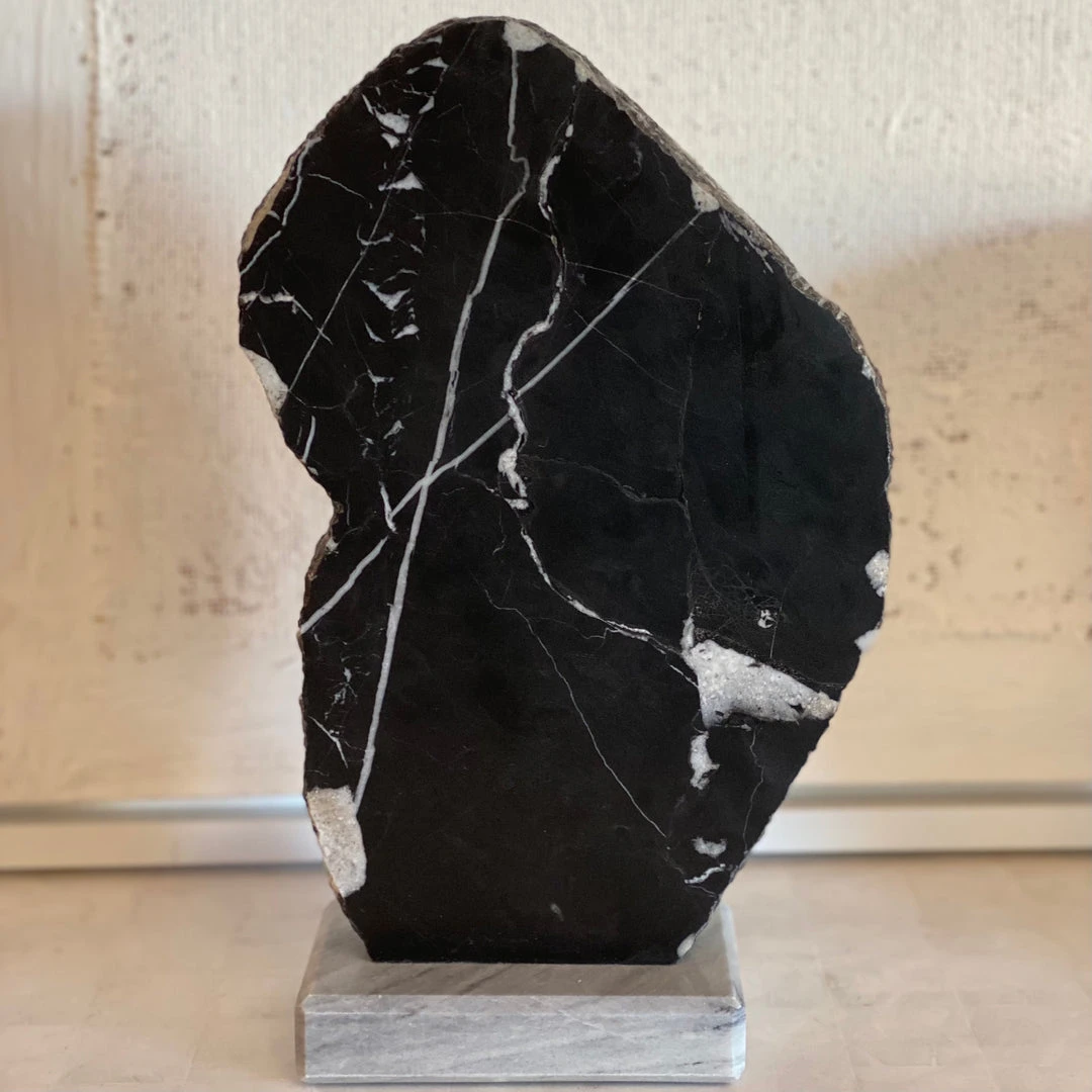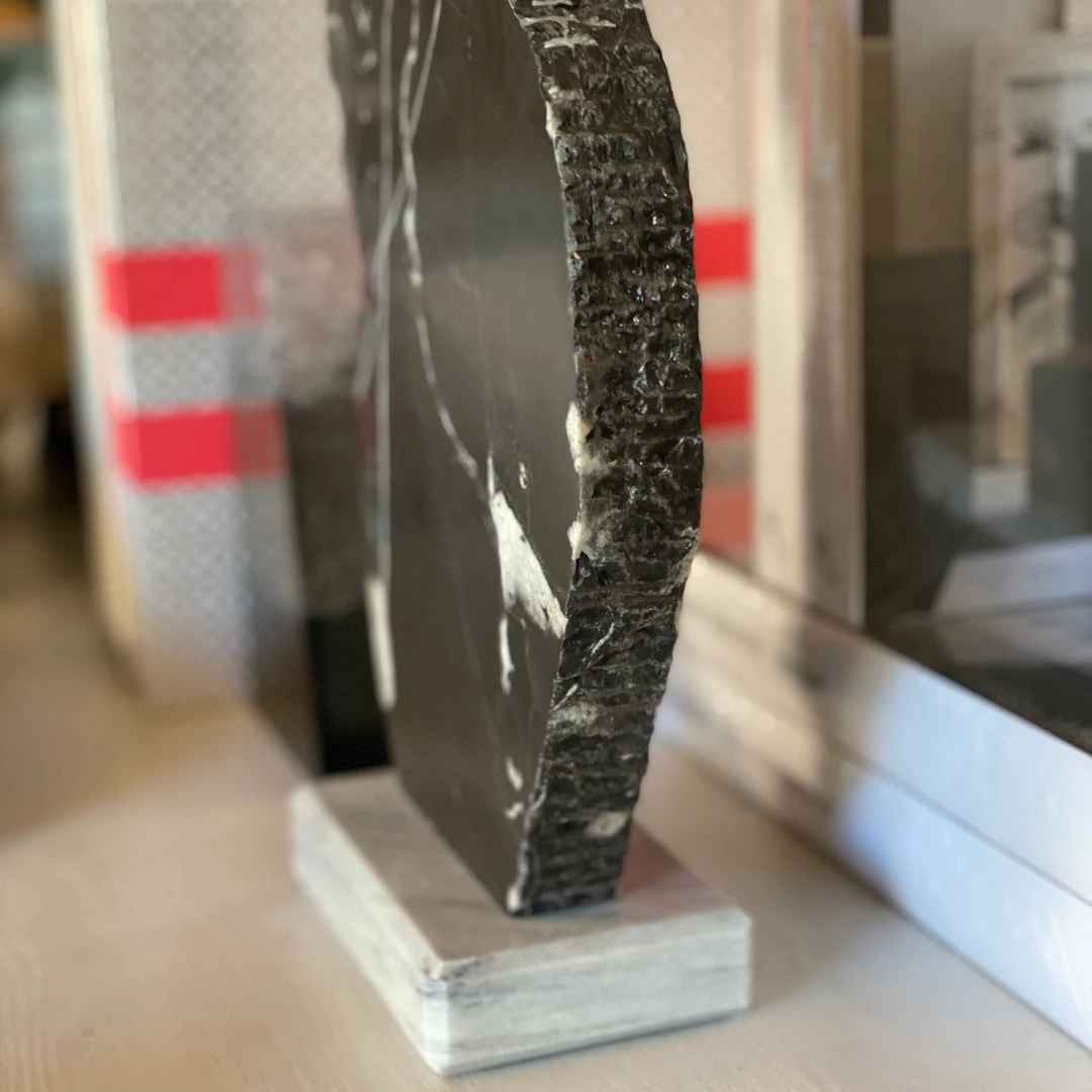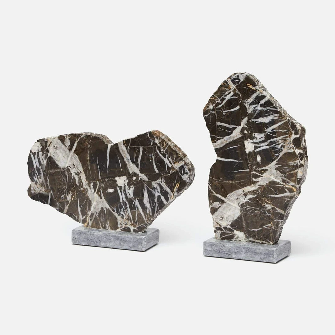 The Kalani Sculpture in Nero Marble and Romblon Stone from Made Goods feature horizontally or vertically oriented slab sculptures with raw edges fashioned from Nero marble. The polished bases are made from contrasting stones. Each piece is unique and delivers artful style to shelving and tabletops alike. *Set Of Two.
