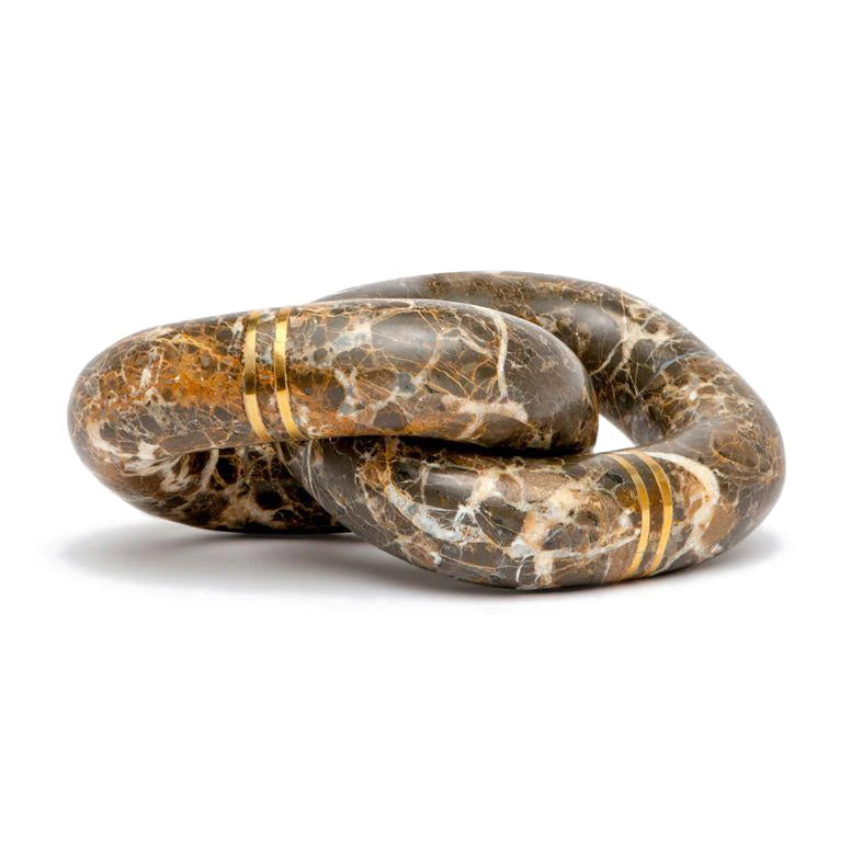 The Kelton Sculpture from Made Goods presents a unique linked snake stone chain with brass inlay. Â Display the Kelton on a console or bookshelf for a definitive designer touch. The neutral coloring works seamlessly in a variety of rooms and plays well with a multitude of home decor schemes from modern to transitional.