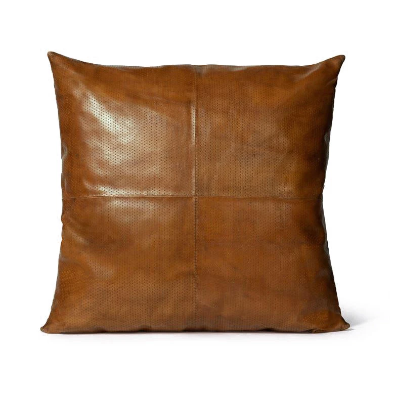 Perforated leather pillows like the Kody Square Pillow Set in Aged Camel Leather from Made Goods will makeover any sofa or chair with a sense of ease and precision. Natural variations in this material may occur. Slight differences in color and texture are characteristics of this collection’s aged full-grain leather. This durable, high-quality leather may show inherent markings, distressed appearance, and variations in pattern.*Available in two sizes.
