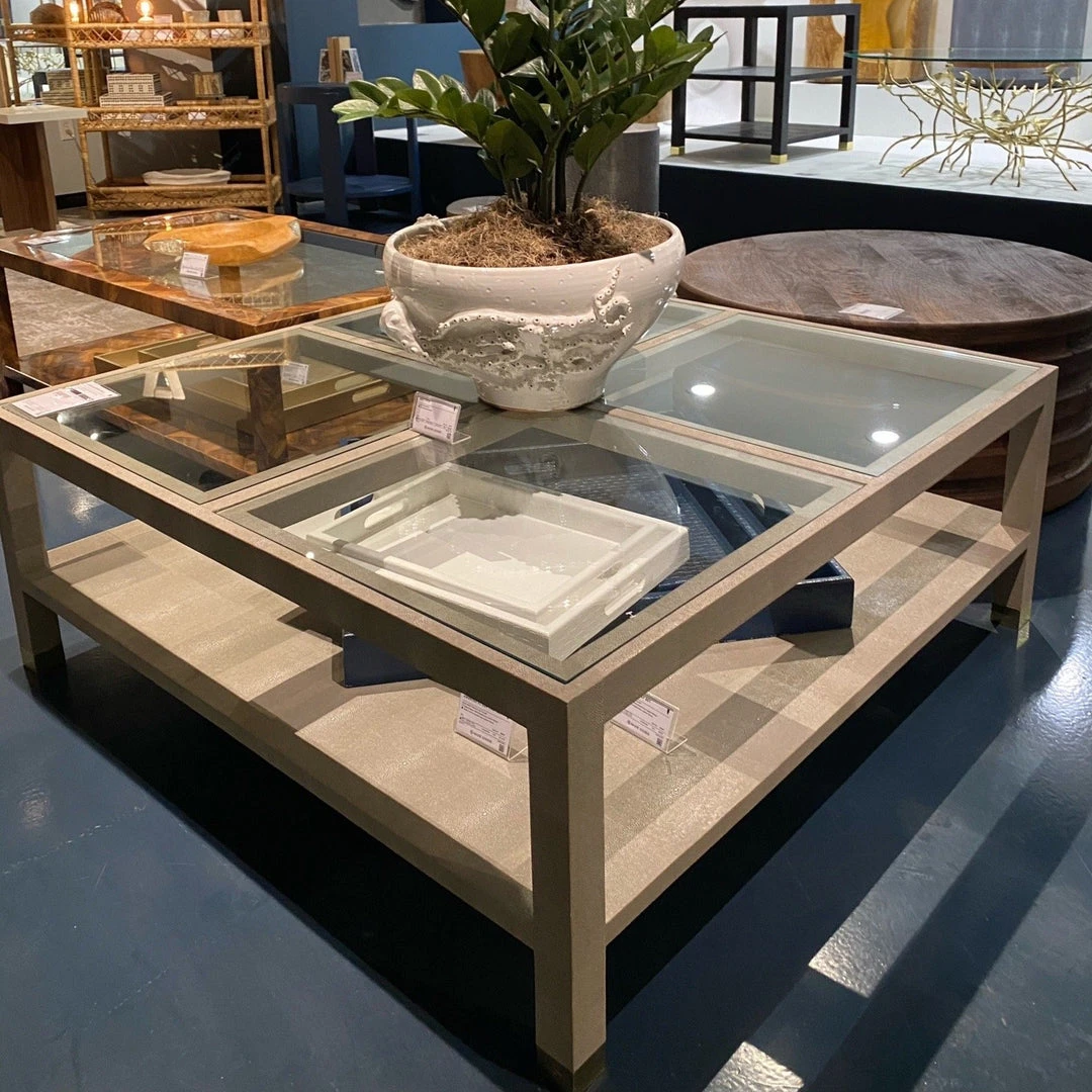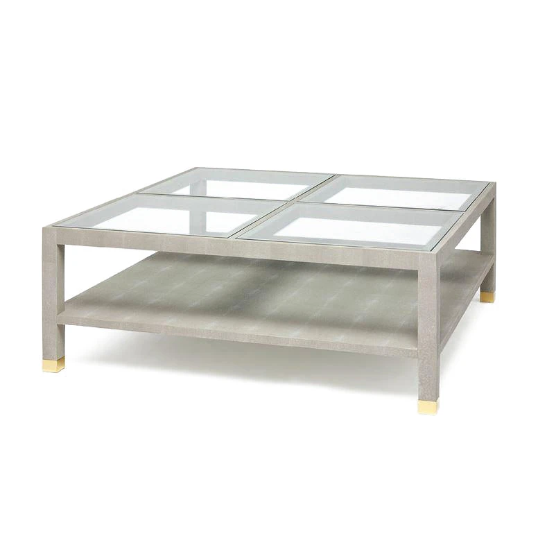 The Lafeu Square Coffee Table in Sand Faux Shagreen from Made Goods has a square frame fully finished in a luxurious faux shagreen finish. A glass top reveals the piece’s lower shelf, and the table’s feet are capped in brass for a chic finishing detail.