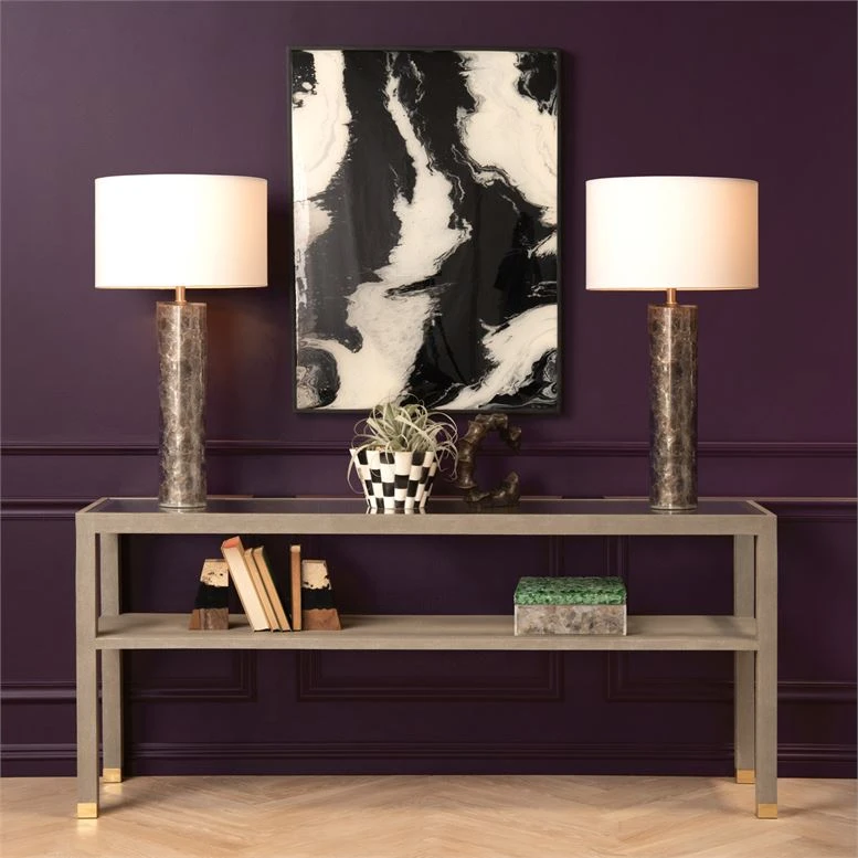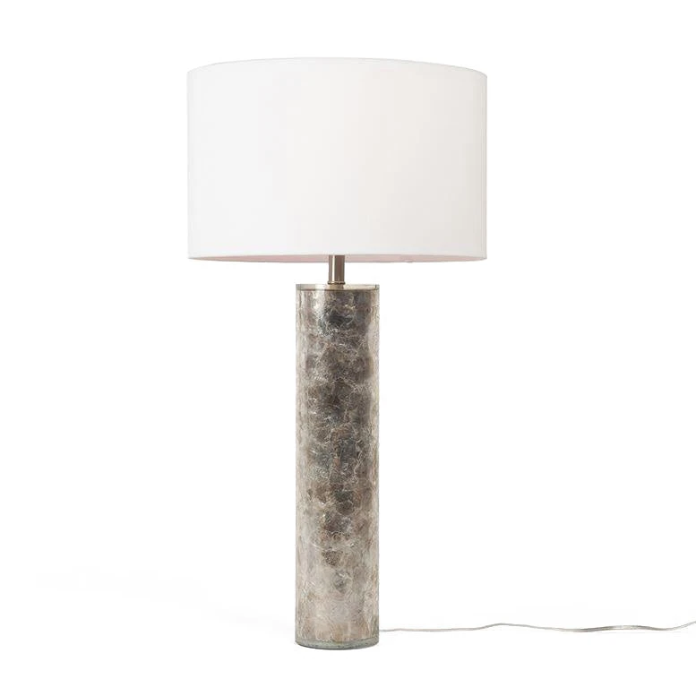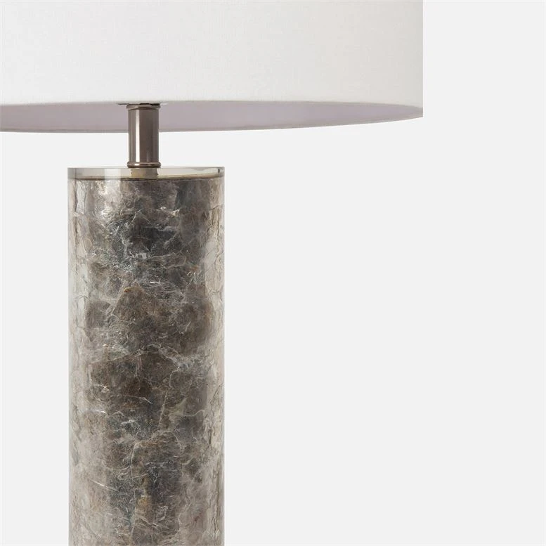 The Leigh Table Lamp from Made Goods features a round column covered in a unique and luxurious Micah stone with delicate variations of beige and white. Topped with a linen rectangle off white shade, the Leigh offers a high-end designer look for any room of your home.