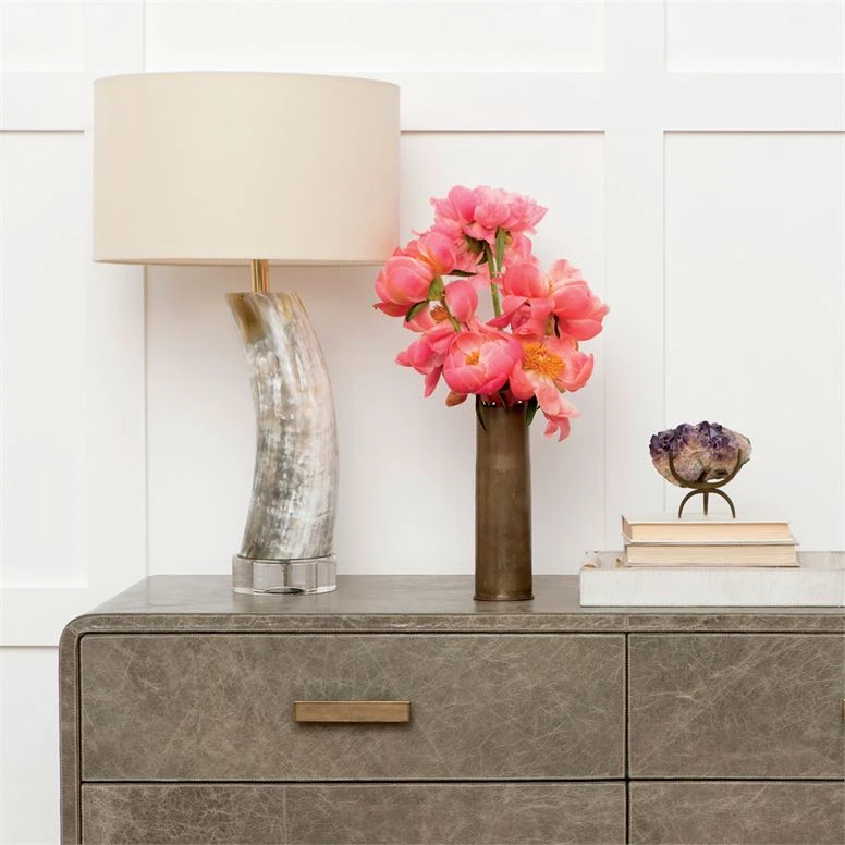 The Nate Large Tray Set from Made Goods features white hair-on-hide with brass detailing and decorative handles. This long, narrow tray size is perfect for consoles and vanities. Natural variations in this material may occur. Slight differences in color and texture are characteristics of this collection’s aged full-grain leather. This durable, leather may show inherent markings, distressed appearance. distressed appearance.
