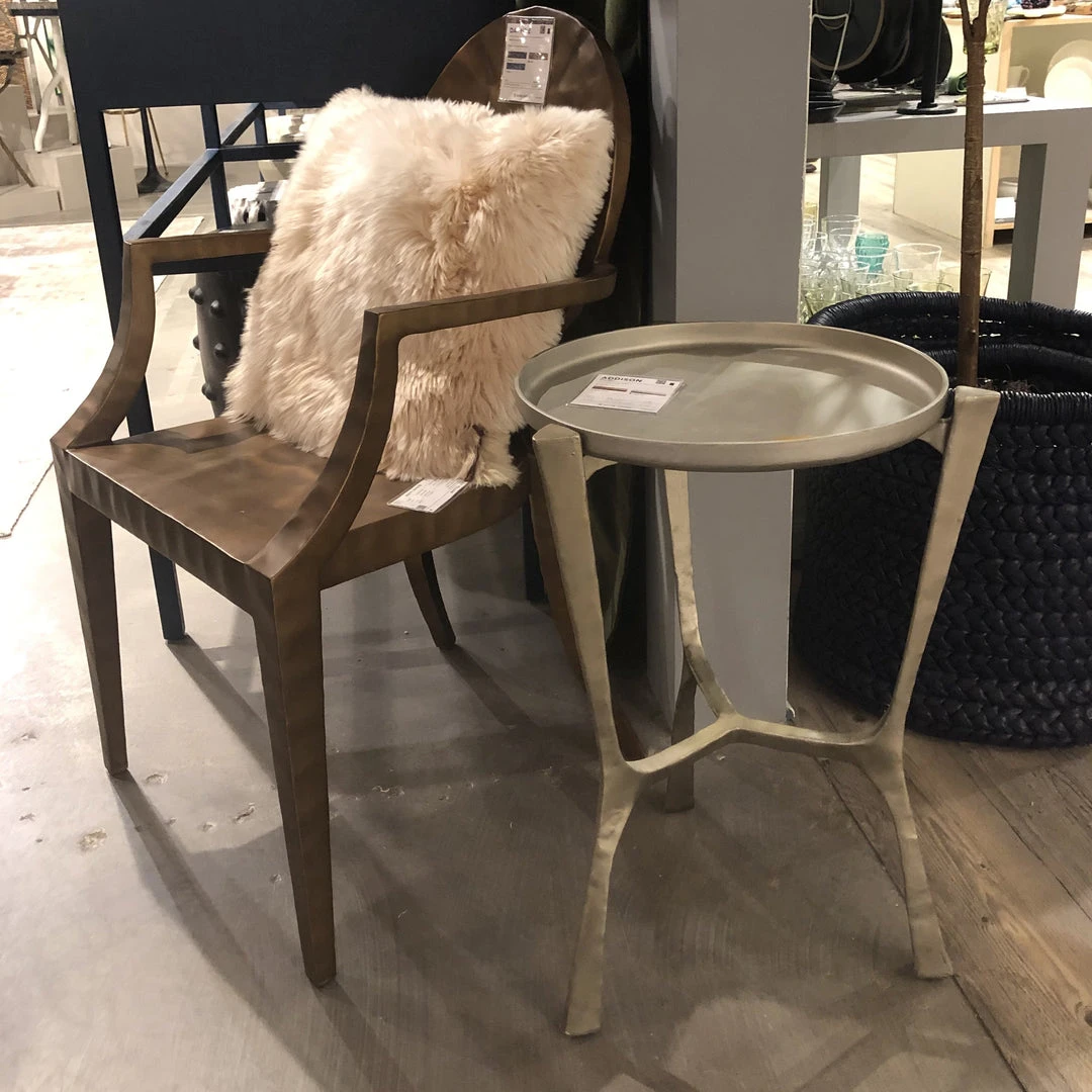 The Addison Side Table in Aged Silver from Made Goods offers a wrought iron modern, industrial design. A compact side table with a removable top gives you the flexibility of using it as a tray to serve beverages and appetizers. Supported by a tripod base, this round accent table can be used in your living room or as a bedside table. Ideal choice for your home or office.