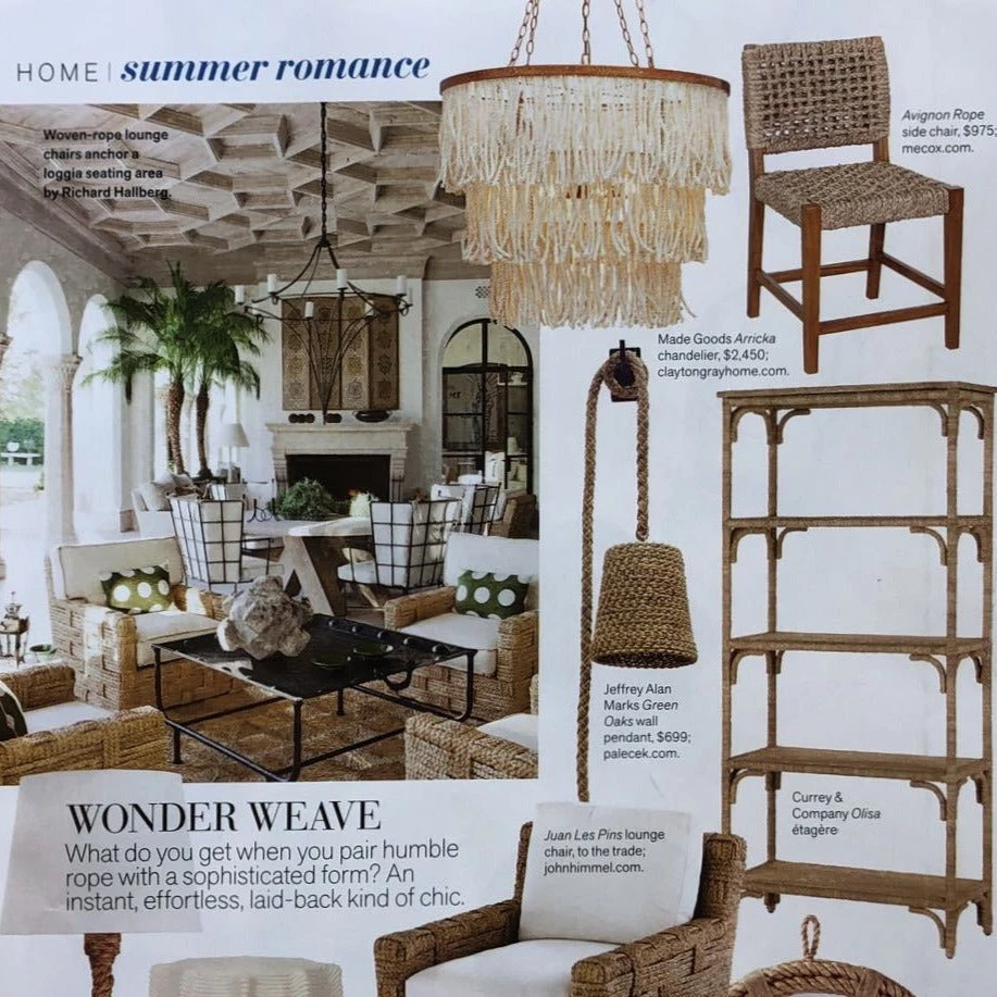Made Goods offers the Arricka Chandelier in Bleached Abaca Rope with a round Gold Metal frame that adds polish to this modern chandelier lighting. The contemporary design is created by weaving together an organic natural fiber with short pieces of rope that artfully aligns this 3 tier hanging light, an ideal addition to your dining room. Bring a fresh look of airiness and movement to your home by placing the Arricka in the entry, kitchen, powder room or bedroom for a balanced and casual vibe. As seen in Veranda magazine.